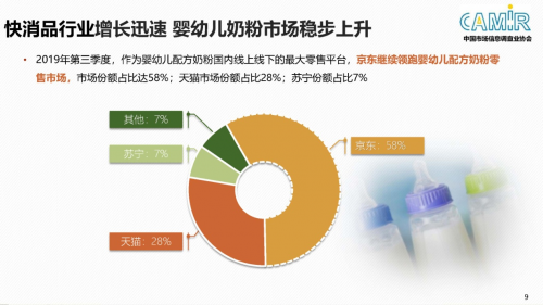 据国家统计局主管的中国市场信息调查业协会最新发布《2019年第三季度B2C电商平台市场消费报告》。报告显示京东超市婴幼儿配方奶粉在2019年第三季度所占市场份额达58%,已成为婴幼儿配方奶粉国内线上线下的最大零售平台。