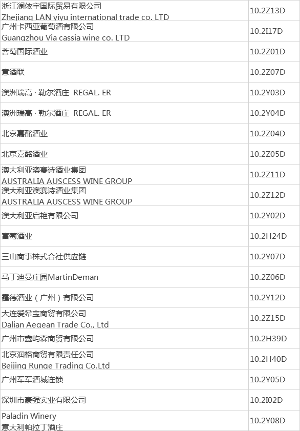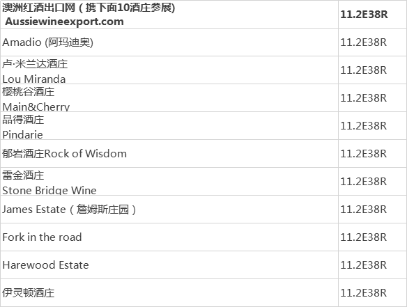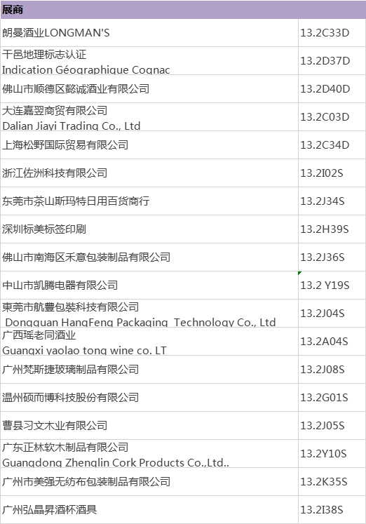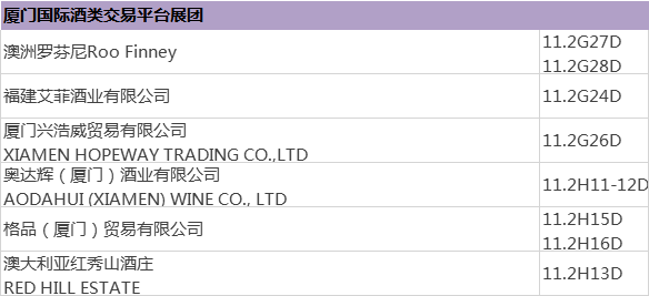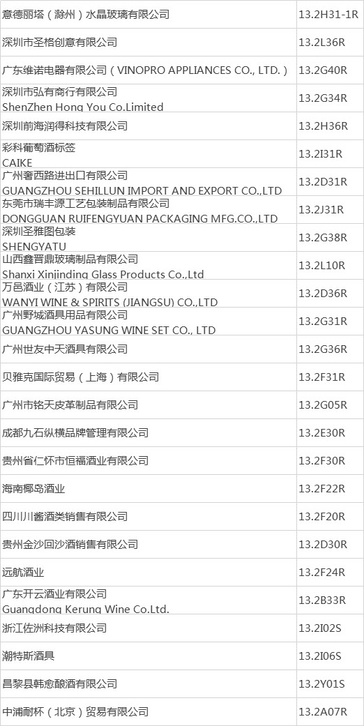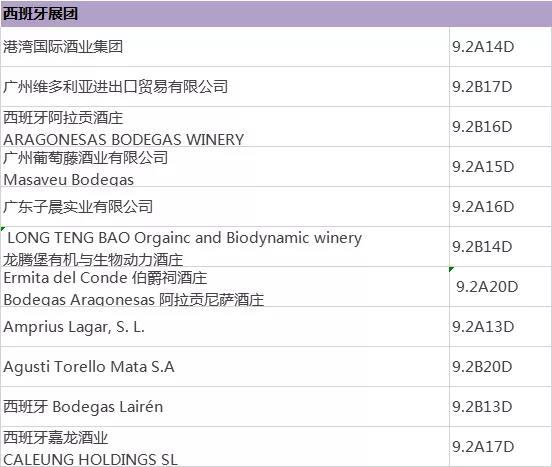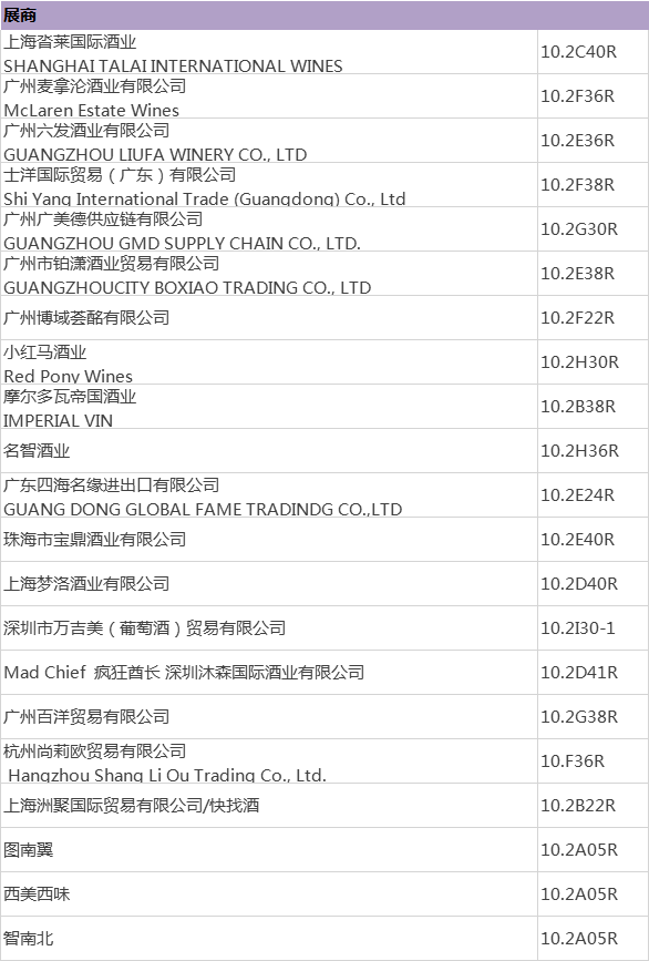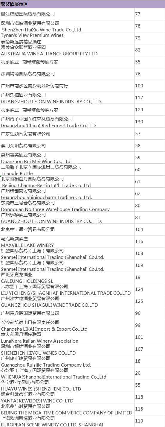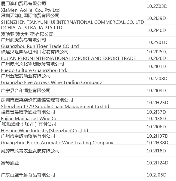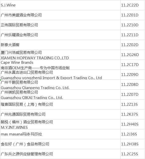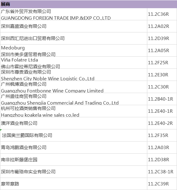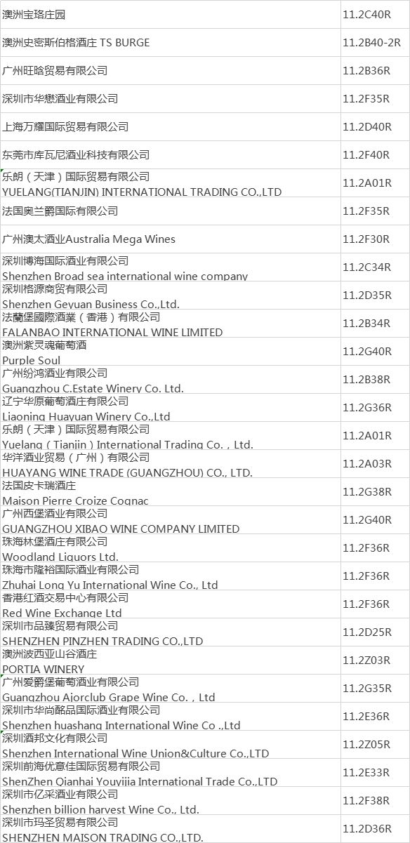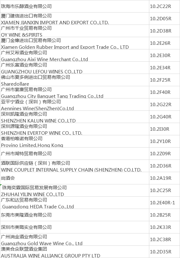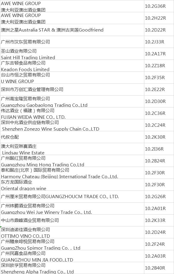 全球葡萄酒进口商本届展会表现强劲,如西味国际(西班牙佳酿)、广州汉东贸易有限公司(西施佳雅官方进口商)、澳出集团(澳洲精品),高宝隆(代理麦格根)、中国进口葡萄酒联盟、智南北(智利精品酒)、小红马酒业(法国精品酒)、EVO(美国精品酒)、澳太商贸(澳洲宝树)、博海国际酒业(多国精品)、酒联国际(法拉宾干邑)、法蘭堡國際酒業(精品干邑)、格源商贸(多国精品)、奢西路(精品干邑白兰地)、泰和酩庄(法国精品)、德兰索(里奥哈精品)、世界知名酒庄如智利 Vina Casa Verdi、爱慕酒庄、西班牙阿拉贡酒庄、里奥哈名庄橡树河畔庄园、Rockcliffe 酒庄、南非 Sadie 赛蒂家族酒庄,KWV酒庄,Morgenster 酒庄、宝石树酒庄 Gemtree Wines、澳大利亚金黄鹂酒庄、意大利巴尔内拉酒庄等参展商大面积参展,希望进一步拓展中国葡萄酒市场。