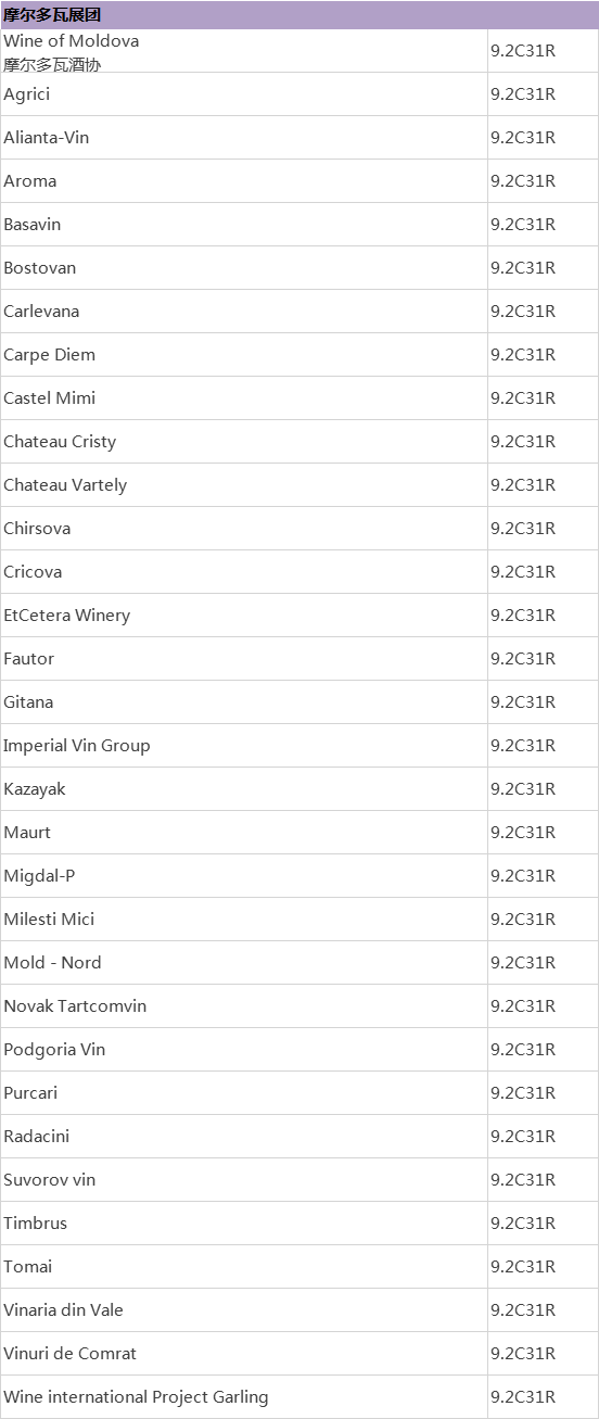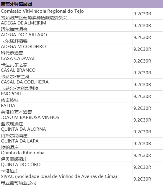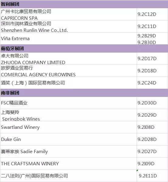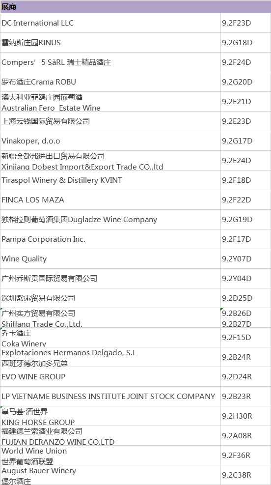 法国展团、意大利展团、澳洲展团、西班牙展团、智利展团、葡萄园展团、葡萄牙特茹展团、南非展团、东欧国家展团、越南展团、北马其顿展团、捷克展团、摩尔多瓦展团、罗马尼亚展团、意酒文化促进会展团、宁波进口商品中心、宁夏贺兰山东麓葡萄酒银川产区、遵义产区-仁怀酱酒展团、厦门国际酒类交易平台展团、中国进口葡萄酒联盟等数十国家展团应邀携多家精品酒庄大规模参展。