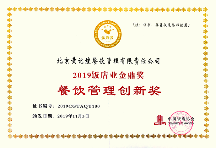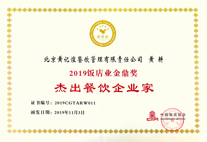 在11月3日举办的饭店业权威奖项“金鼎奖”颁奖盛典上,黄记煌荣获“2019饭店业金鼎奖—餐饮管理创新奖”,同时,董事长黄耕先生获得“2019饭店业金鼎奖—杰出餐饮企业家”殊荣。这是行业对于黄记煌在品牌运营和管理层面的双重肯定。