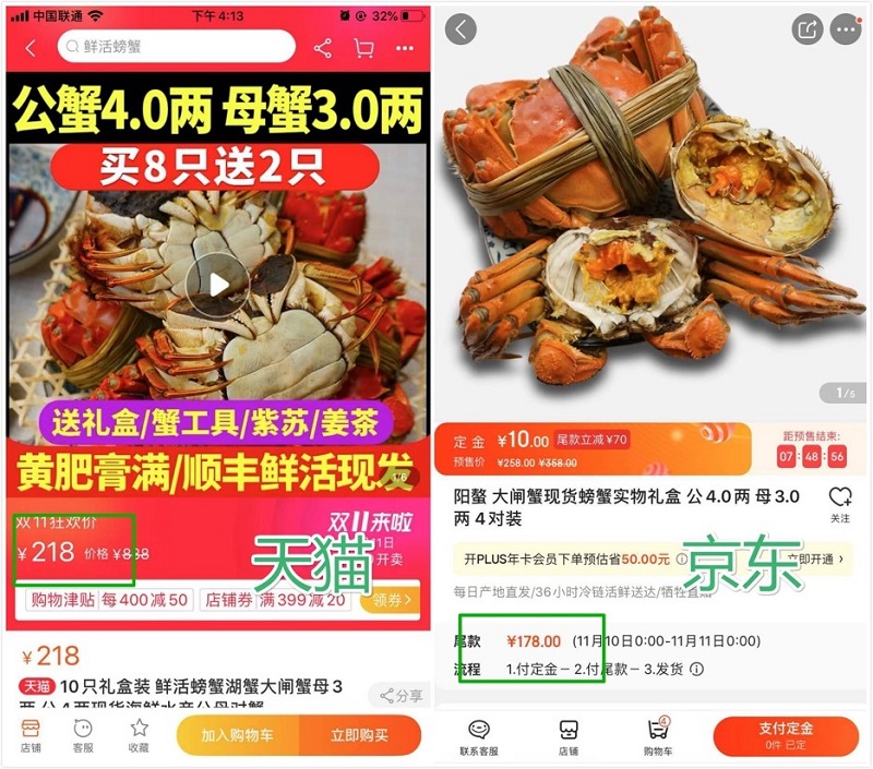 先说大家都十分喜爱的大闸蟹,现在吃正是最后蟹肥味美的时节,而且还有各种优惠促销,是跟亲朋好友一起分享的好选择。这款在天猫上价格要218,京东上预售看起来比天猫贵,实际上尾款减70只要188,立刻便宜了30块。这款拼多多已经下架了,没能比较有点可惜。