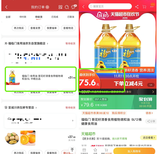 在京东超级百亿补贴页面上,小编还发现了福临门葵花籽食用油5L装的31.9元。同一款商品天猫11.11活动价75.6元两桶,算下来一桶37.8元,也就比京东贵了两包康师傅方便面。福临门作为家家户户日常食用油品牌,压榨花生油、一级大豆油、玉米油还有这款葵花籽油等等之前都有买过,虽然葵花籽油平时价也不是特别高,但这次京东双11价格竟然比平时便宜十几块,还是果断入手了,好油不怕存,特别是今天下单,第二天就到了的速度太让人崇拜了。小编已经光速下单,先买为敬,估计马上就能收到了,送货到家。