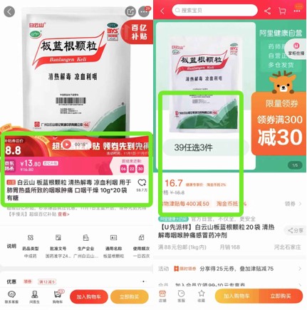 顺着京东超级百亿补贴页面,还会发现,除了维他柠檬茶,板蓝根颗粒也非常值得入手一下,家中常备板蓝根,头疼脑热感冒都不怕。察觉要感冒时喝一包,速速恢复健康活力,重点是20袋包装的白云山板蓝根京东只要8块8。同款板蓝根天猫双11活动价三大袋装39元,平均一袋13元,这种本来就价格不高的商品,京东能优惠近5块,也是真的卖力了,看来这个双11京东一直在宣传的超级百亿补贴千亿优惠是实打实的让利了。