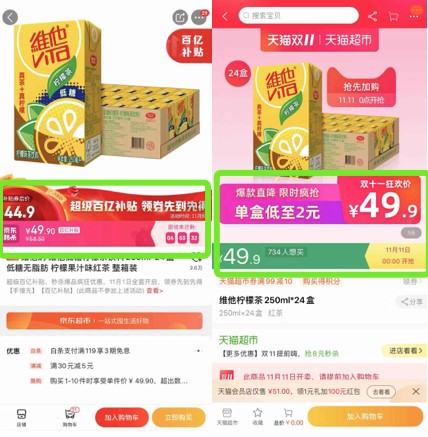 长期加班熬夜压力大怎么办?别担心,维他柠檬茶了解一下。毕竟没有什么是一盒维他柠檬茶解决不了的,如果有建议你买一箱。下面小编真的要说正事了,今天在京东看到一箱维他柠檬茶秒杀价49.9元,正感叹双11价格实惠的时候,又机智的看到页面上还有补贴券后价44.9元,这也太惊喜了。一盒维他柠檬茶不到2块钱,要知道便利店和超市明码售价4块5啊。精打细算的我速速去看了天猫售价,同款商品天猫49.9元,虽然价格也还可以,但是没有京东超级百亿补贴页面补贴券后价44.9元更实惠呀。