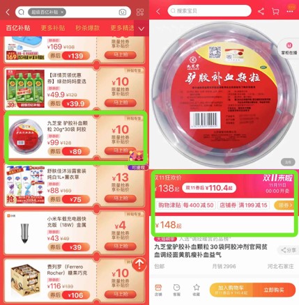 经常困扰女生的还有气血不足的问题,九芝堂驴胶补血颗粒可以了解一下,可以改善贫血状况。京东双11九芝堂驴胶补血颗粒30袋装的补贴券后价89元,比天猫双11活动价110.4元还便宜21块钱,有需要的小伙伴抓紧时间去京东囤起啊,双11购物还不就是图一个实惠。