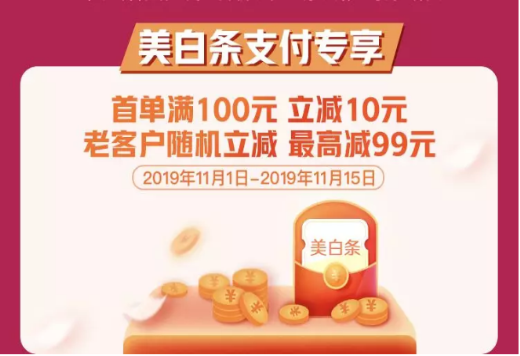 11月1日-15日,美白条支付专享:首单满100元,立减10元;老客户随机立减最高减99元,真金白银送给你!