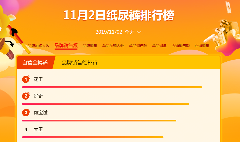 记者看到,在11月2日的苏宁纸尿裤排行榜上,花王品牌销售额和品牌销售都排名第一。