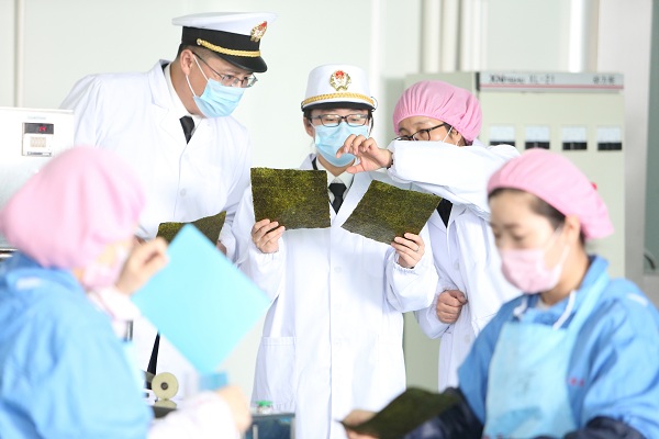 图为:海关关员现场查看紫菜生产过程中安全卫生情况 林军/摄