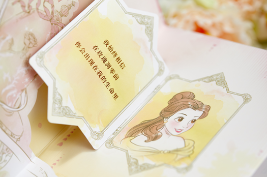 打开公主蜂蜜礼盒,每一面折页对应的都是一位公主,充满童话色彩的图案,并附有一句告白语。比如贝尔公主的表白语:“我始终相信,在玫瑰凋零前,你会出现在我的生命里。”真的非常浪漫,颜值也是超高!