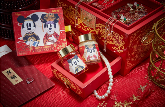 森蜂园喜蜜的包装也非常精美,主色是正红色的,而且是中国风的米奇米妮形象,米妮还是凤冠霞帔的哈哈,真的很好看。外包装上还有祥云、灯笼等等设计,很走心了,颜值很高。当婚礼伴手礼真的超合适,喜蜜喜蜜,甜甜蜜蜜。