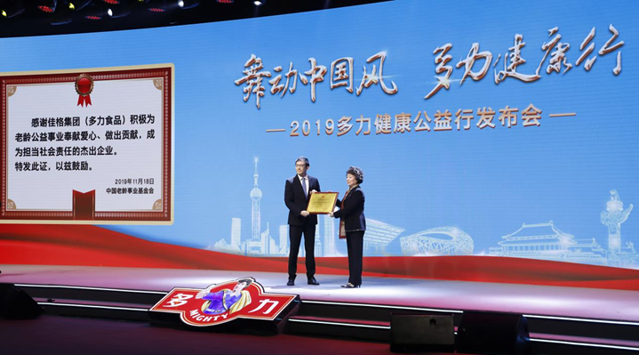 中国老龄事业发展基金会监事长杨安娜向多力颁发荣誉证书