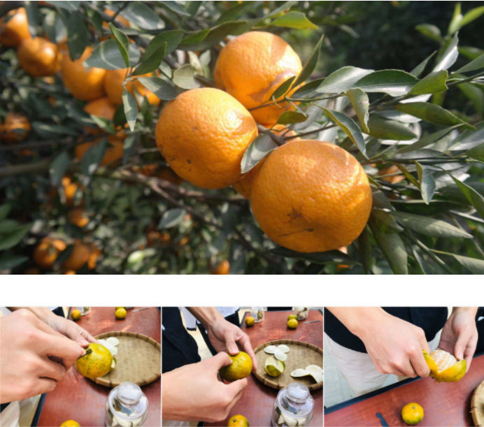 每当11月—12月新会大红柑成熟之际,陈李济必会前去江门新会核心产区选取果实圆润,油胞饱满的大红柑来制作陈皮,对称二刀法、正三刀法是陈李济最常用的开皮方式。看似简单的三瓣,两瓣,却有其世世代代流传下来的特定技巧,不是简单就能学会的。