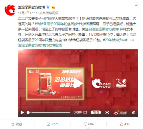 至此,其实洽洽已经完成了品牌20周年庆生仪式的第一环,让20周年特别版包装及文化卡片成为了社交币,跟用户共情;但洽洽并没有满足于此,而是趁热打铁,从共情的平台与话题内容进行纵深推进与延展,与用户进行更深层次的互动与沟通。