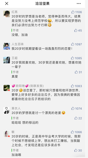 在微信私域平台,则通过官方微信以及朋友圈等高社交流量垂直空间扩散愿望征集信息,鼓励洽洽20岁的用户写下“你的20岁梦想”,同样掀起了一波梦想热潮,激发很多人分享,形成了裂变传播。