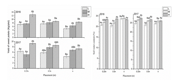 图1 种植距离和密度对红薯产量和土壤含水量的影响