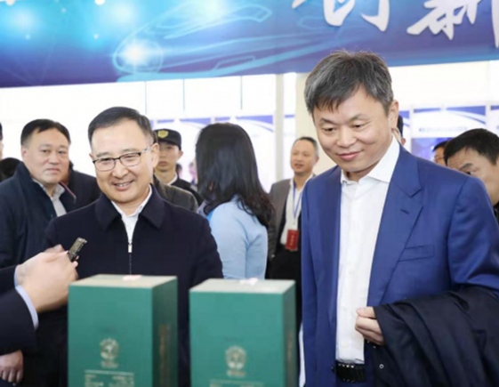 (上海市退役军人事务局党组书记、局长黄冲与韩宏伟先生共同走访上海军酒有限公司展位)