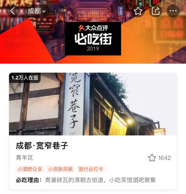 据了解,宽窄巷子将在美团旗下平台拥有专属页面,用户可以在手机端查询步行街上每一家主力商户的位置信息、营业时间、精选点评等信息,还可以在达人探店、商圈新鲜事、商圈动态信息流等模块看到整条步行街范围内的相关信息。