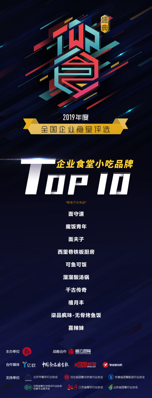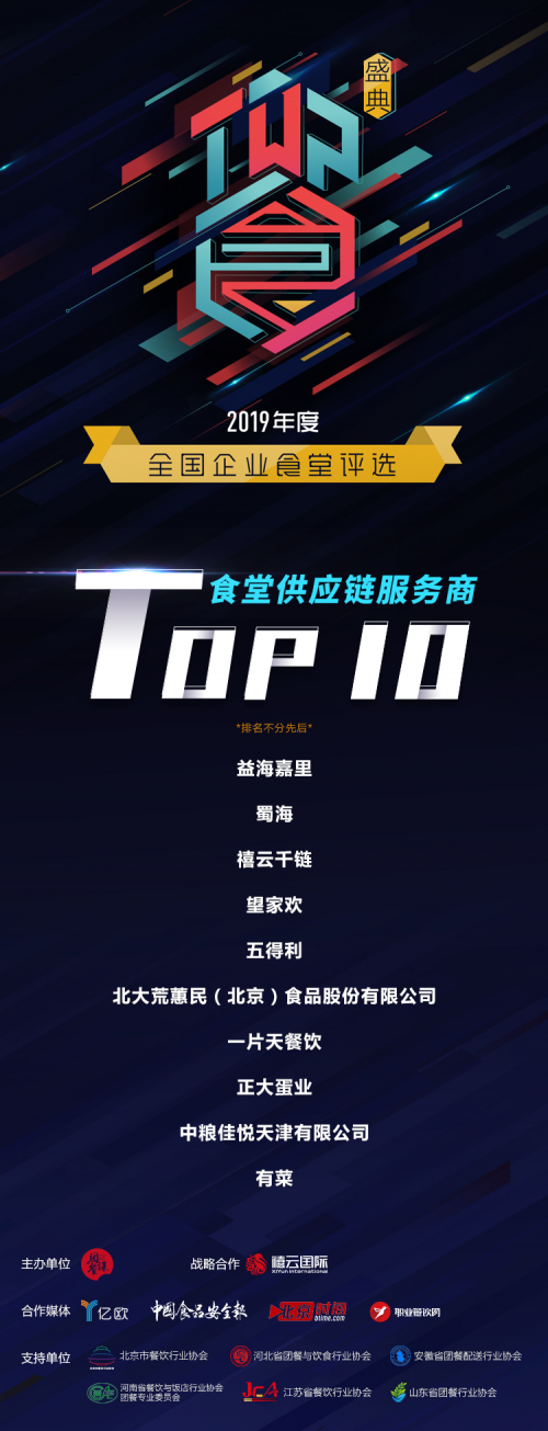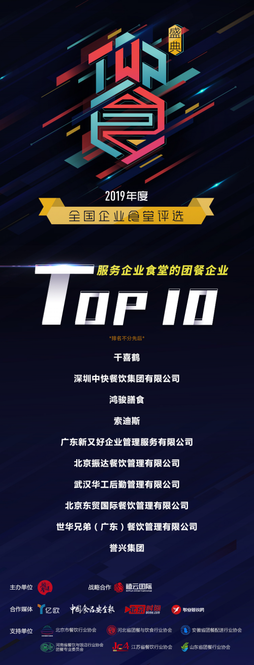 本次评选特别针对专业的第三方食堂服务商设置的6个奖项——2019年度服务企业食堂的团餐企业、信息化服务商、供应链服务商、食品安全服务商、企业食堂小吃品牌、设备供应商TOP10,分别由头部团餐企业千喜鹤、中快、鸿骏膳食,以及各类优质服务商如雄伟科技、满客宝、云澎科技、益海嘉里、蜀海、禧云千链等收入囊中。