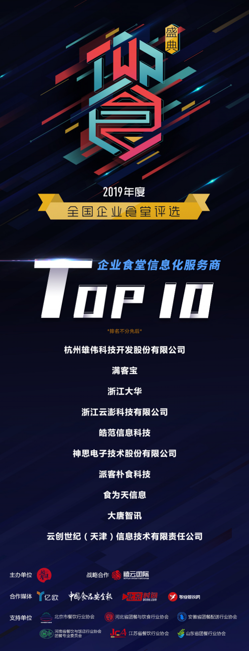 出席当天峰会并发表演讲的雄伟科技董事长董佳尉认为,团餐服务链应该通过数据共享、分工协同的方式,实现从需求、监管、服务到供应全链条的数字化升级,可以提升整个团餐服务链15%左右的收益。可见,团餐信息化已是大势所趋,不仅行业已经具备了信息化转型的主客观因素,产业链各环节也对信息化建设提出了强烈需求。雄伟科技、满客宝、云澎科技等一批在团餐信息化建设领域做出了杰出成绩的企业,也成功入选2019年度企业食堂信息化服务商TOP10榜单。