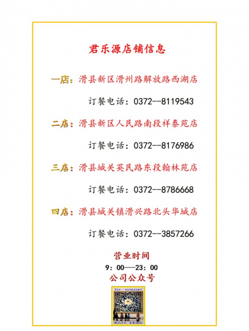 深有忧患意识和竞争意识的张建军为了保证饭菜质量,叫响君乐源品牌,亲自采购放心食材,严把原料质量关,严控口味调制,亲自掌勺烹制,始终坚持不符合标准的饭菜不上餐桌的经营理念,保证既让顾客吃的饱,吃的好,还要花钱少。久而久之,经济实惠、安全放心成了“君乐源”的代名词,深受消费者青睐。 随着滑县新区的发展建设,县城人口规模不断膨胀,眼光睿智的张建军敏捷地意识到:君乐源迎来了发展壮大的春天:2009年,祥泰苑店开业;2014年翰林苑店开业;2018年华城店开业!出则繁华,入则宁静,便利的交通,优雅的环境,贴心的服务,可口的饭菜,放心的质量,很快就吸引了大批食客,并成为滑县当地私人就餐、亲朋聚会、宴请宾朋的首选。