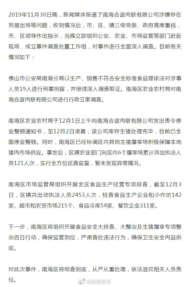通报称,2019年11月30日晚,新闻媒体报道了南海合谊肉联有限公司涉嫌存在死猪出场等问题,收到情况后,市、区、镇三级党委、政府高度重视,市、区领导作出指示,当晚立即组织公安、农业、市场监管等部门赶赴现场,成立事件调查处置工作组,对事件进行全面深入调查。