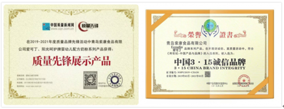 2019年,爱可丁奶粉相继获得中国产品质量监督中心和全国优质品牌战略推广联合会共同颁发的“中国315诚信品牌”,率先入选中国质量新闻网“质量先锋档案”,安全品质屡次获得官方机构认可。