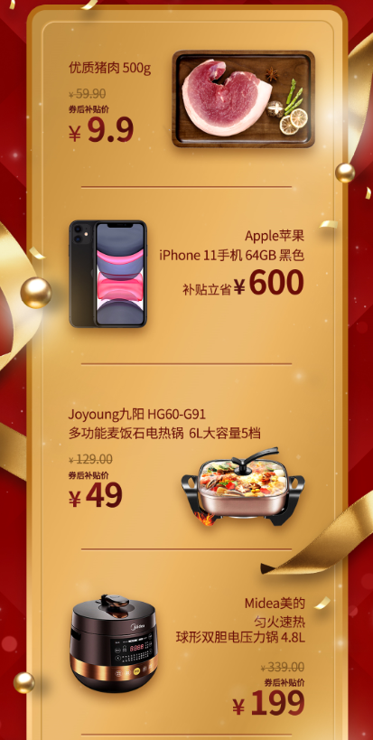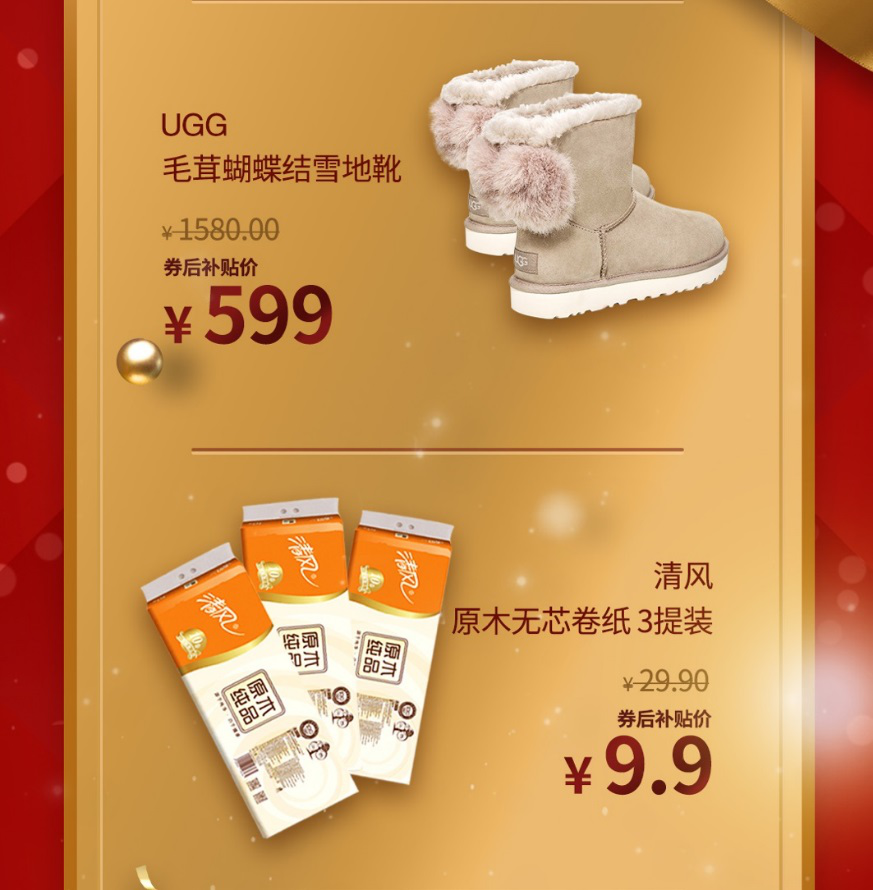 重中之重的是,让消费者心心念的超级百亿补贴爆品仍将持续。届时,在“百亿补贴”会场,各种爆品好物携巨额好券持续放送,数量有限先“秒”先得,以秒杀点燃消费者购物热情!品牌优质猪肉百亿补贴券后一斤9块9即可到手,低价开“秒”即享冬季“轻奢”单品。同时大牌好物12.12齐爆发,iPhone 11 64GB补贴立省600元;“现男友”李现倾情推荐、原价339元的美的球形双胆电压力锅券后补贴仅售199元,当红小生邓伦推荐的九阳多功能麦饭石电热锅券后补贴价49元,100块能买2件的明星爆款厨具,不“秒”即亏!寒风凛凛,保暖更当时,UGG 2019冬季新款女士经典雪地靴,原价1580元,券后补贴599元即可到手;原价438元的水星家纺旗下百丽丝全棉四件套,此次券后补贴价只要99元,温暖加量不加价!