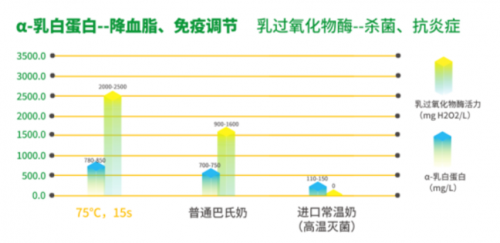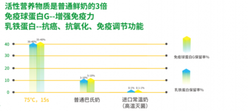 新希望乳业自建生态牧场,牧场精选澳大利亚及进口荷斯坦奶牛,奶牛体细胞数≤30万个/mL。好奶源, 24小时鲜奶生乳的菌落总数低于≤5万CFU/mL,优于欧盟标准(≤10万CFU/ml)。在全体系推进75℃/15″的低温巴氏杀菌工艺,活性营养物质是普通鲜奶的三倍。其中,24小时鲜奶的乳铁蛋白含量和免疫球蛋白G保留率高达40%,普通鲜牛乳仅能留存3%-10%,进口常温奶仅留存0.1%,乳铁蛋白具有抗癌、抗氧化、免疫调节的功能;另外,24小时鲜奶的α-乳白蛋白≥780mg/L,乳过氧化物酶 ≥2000mg H2O2/L,这些活性营养物质具有提升免疫力、抗氧化、抗菌等作用。作为业界首款以时间命名的鲜奶,24小时鲜奶只卖当天,将工厂和牧场设置在距离城市150公里的“鲜半径”内,实现产品上架到下架不超过24小时,2-6℃智能冷链运输,全程护航从牧场到餐桌的新鲜和营养。