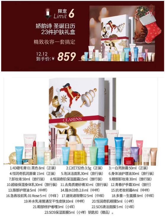 很多男性送圣诞礼物时可能会很纠结,因为女孩的化妆品、护肤品实在是太多了,睫毛膏、口红、面膜、面乳、面霜、卸妆液等等,看着眼睛都花了,加入不知道怎么选,干脆一口气全买了。娇韵诗就为大家准备了23件圣诞护肤礼盒,对,你没有听错,里面拥有23件关于保湿、卸妆、清洁、彩妆、面膜等产品,当你将这件超级大礼包送到女友面前时,估计会感动到哭吧?别看产品众多,但价格却一点也不昂贵,原价899元的大礼包,现在到手价为859元,圣诞节想给她最全的,选这个准没错!