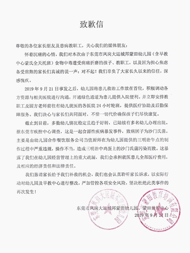 9月27日,蒙田幼儿园发表致歉信,称经东莞市疾控中心调查发现,这是一起食源性疾病暴发事件,系合作餐饮公司当值厨师为幼儿园提供的三明治午点制作过程中严重违规操作不当致沙门氏菌污染引起。据悉,迈思豪餐饮实业有限公司是一家专门从事对企事业单位和各社会团体的员工食堂进行承包经营和管理服务的专业性公司,也与深圳市第二高级中学、深圳市宝安区人民法院在内的多所学校和机关单位有合作关系。