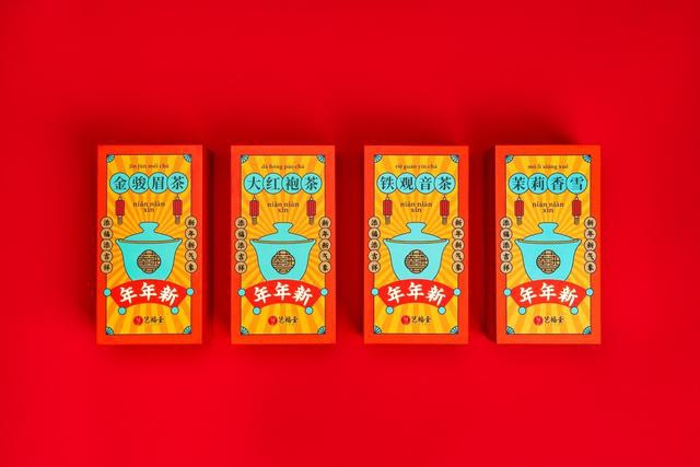 茶,雅俗共赏,可以作为"柴米油盐酱醋茶"的生活必须品,可以作为"琴棋书画诗酒茶"的文化消费品,也可以作为"烟酒茶"的馈赠礼品。茶是天地精华孕育的祥瑞仙草,也是抗氧化、抗衰老、降三高、治未病的健康饮品。烟酒可能视个人喜好而送,而茶却是家家户户普适的礼品。为了均衡天南地北各地的饮茶偏好,年年新礼盒选择知名度非常高的四大名茶,有北方人喜欢的茉莉花茶,有南方人喜欢的铁观音、大红袍,还有南北方人都喜欢的金骏眉。为了提高礼盒的价值感,年年新采用茶、盏结合的方式,用建盏璀璨烟花主人杯与四款名茶锦礼搭配,寓意新的一年大盏(展)鸿荼(途)。
