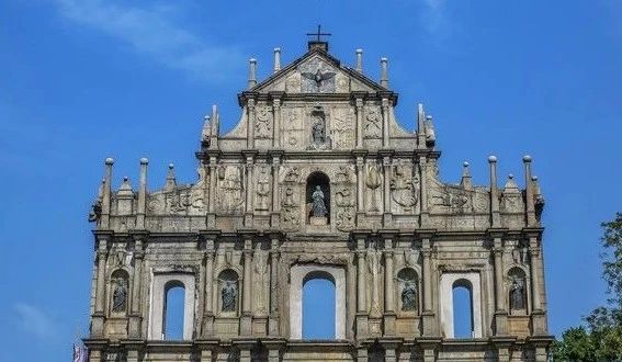 大三巴牌坊建筑糅合了欧洲文艺复兴时期与东方建筑的风格而成,体现出东西艺术的交融,雕刻精细,巍峨壮观。由三至五层构成三角金字塔形,无论是牌坊顶端高耸的十字架,还是铜鸽下面的圣婴雕像和被天使、鲜花环绕的圣母塑像,都充满着浓郁的宗教气氛,给人以美的享受。
