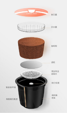 多层分子组合材料:包括原材料PP层、二次材料PP层和EVOH层,有效隔绝水、氧气,锁定产品品质;可变内容物结构:由滤水膜、封口膜、滤纸、泄压倒流结构件、铝箔、高阻隔杯体组成,依据产品冲泡逻辑改变;