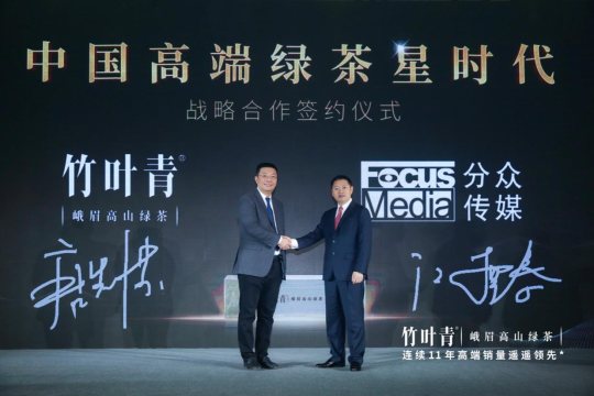 当天,竹叶青与分众梯媒达成战略合作,规划进行3年6亿广告大投放,唐先洪与分众传媒创始人、董事长江南春在发布会上举行战略签约仪式前分别针对品牌传播、未来合作发展发表演讲。