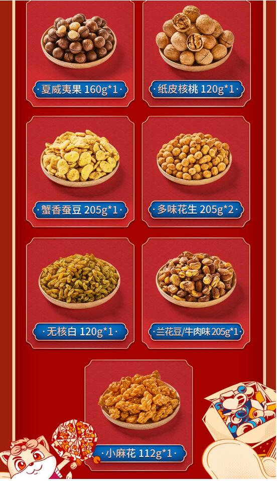 据介绍,这款苏格拉宁子鼠年纪念版三只松鼠年货礼盒内容丰富,包含夏威夷果、纸皮核桃、蟹香蚕豆、多味花生、白葡萄干、兰花豆、小麻烦共8袋不同口味的零食,累计1332g,满足吃货的不同需求,让众口不再难调。