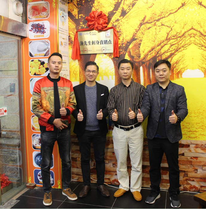 从左至右:渔先生创始人潘总、汇富集团行政总裁陈总、黎泉凉茶中山区总经理、搞鲜科技执行董事郑品