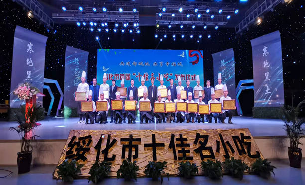 仪式上,发布榆林筋饼、“火烧云”饼、春饼卷豆芽、杀猪菜、粘豆包、大米宴、金沙雪衣奶酪、酸菜汤、驴肉蒸饺、煎酿豆腐、铁锅炖大鹅为绥化“十佳名小吃”。手把全羊、香糯玉米饼、手撕黄金鸡、火锅、土豆丝鸡蛋饼、锅包肉、饭包为“绥化名小吃”。同时,为20家餐饮企业颁奖。