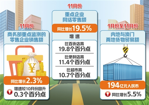 高峰指出,目前国内消费市场主要呈现3个特点。一是网络零售较快增长。数据显示,11月份重点企业网络零售额同比增长19.5%,增速比百货店、便利店、超市分别高19.8个、11.4个和10.7个百分点。二是餐饮销售保持旺盛势头。11月份,全国餐饮收入4964亿元,同比增长9.7%,增速比上年同期加快1.1个百分点。三是在新产品、网购促销等因素的带动下,11月份限额以上单位日用品和化妆品销售额同比分别增长17.5%和16.8%,通讯器材和家电销售额同比分别增长12.1%和9.7%。