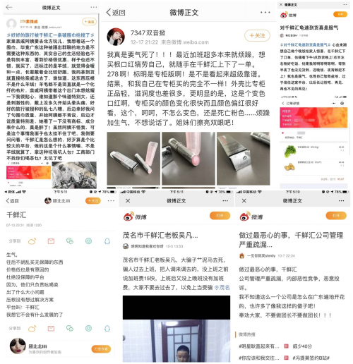 通过对网络曝光信息的整理,笔者在网上也看到了多例因为食品质量问题而引发的用户维权事件,其中最为严重的是《千鲜汇食品安全问题 事出半月无任何处理进展》一文中微博名为“月野兔San”的用户所爆出的食品安全事故。2019年12月14日该用户及其家人食用了在千鲜汇平台购买的蔬菜和鱼之后出现严重的食品中毒症状,连续3天在医院中接受治疗,给用户及其家人造成了严重的身心伤害,目前该用户已经通过网络媒体进行曝光维权,并将问题反馈至12315平台。但根据后续用户持续曝光内容分析,对于该问题,千鲜汇的负责人并没有给予相应的重视。