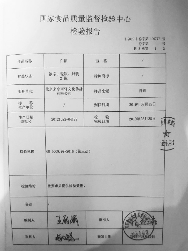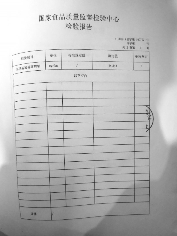 来今雨轩提供的一份检验报告显示,今年8月15日,来今雨轩在经过了长沙市公证处公证的前提下,将这批白酒中的样品送至国家食品质量监督检验中心进行检测,检测结果显示,白酒产品中含有环己基氨基磺酸钠,测定值为0.344mg/kg。