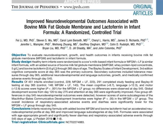 李斐婴幼儿营养研究在国际期刊中正式发表再一次印证了添加乳脂球膜与乳铁蛋白配方奶粉的临床有效性。