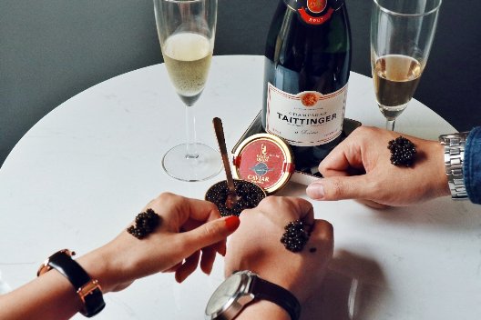 除了直接入口单独食用,鱼子酱也可以和各式美酒佳肴相搭配,呈现出独特又缤纷的口感。微酸的香槟是鱼子酱的品质之选,奶香浓郁的鱼子酱酱汁与入口清爽的香槟相互碰撞,在喉腔中留下悠长的余味;冰凉的伏特加亦是鱼子酱的绝佳搭档,凛冽的口感与鱼子酱的香醇交互融合,让食客入口难忘;除此之外,用鱼子酱点缀牛排、奶油意面或者各式点心,可为菜肴本身增加一抹鲜醇之味。除了惊艳舌尖的好滋味,鱼子酱更是富含人体所需的微量元素、矿物盐、蛋白质和重组基本脂肪酸,有效缓解皮肤衰老,防止色素沉着,长期食用能够有效增强人体免疫力,对身体健康大有裨益。