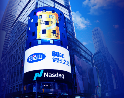 完达山乳业全新打造“为所爱 尽所能”品牌主题,重塑品牌推广内核,在被誉为“世界十字路口”的纽约时报广场“中国屏”上,完达山乳业15秒品牌形象展示短片以每日72次的频率滚动播放,向全世界展现中国乳企的诚信之光。