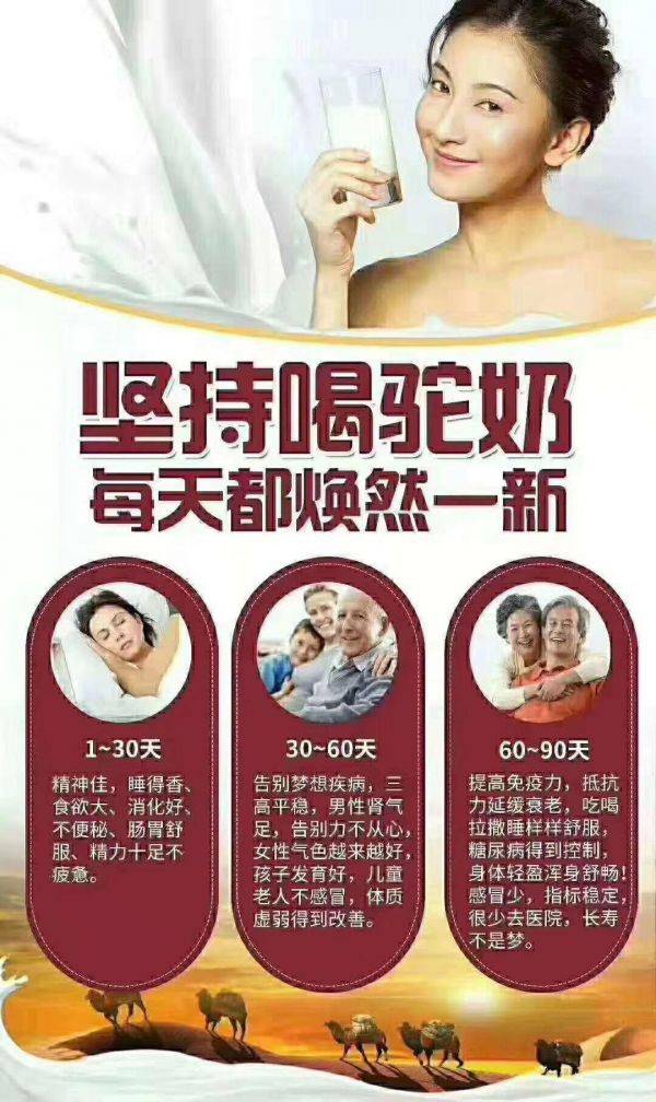 骆驼乳中的主要营养成分是易吸收,属完全蛋白的蛋白质;骆驼乳中含有人体必需的八种氨基酸,大量的中长链脂肪酸、多种不饱和脂肪酸和以乳糖为主的碳水化合物;几乎含有所有已知的维生素和丰富的矿物质,且含量均高于他乳。骆驼乳中富含溶菌酶、乳铁蛋白、乳过氧化物酶和免疫球蛋白等天然生物活性因子。