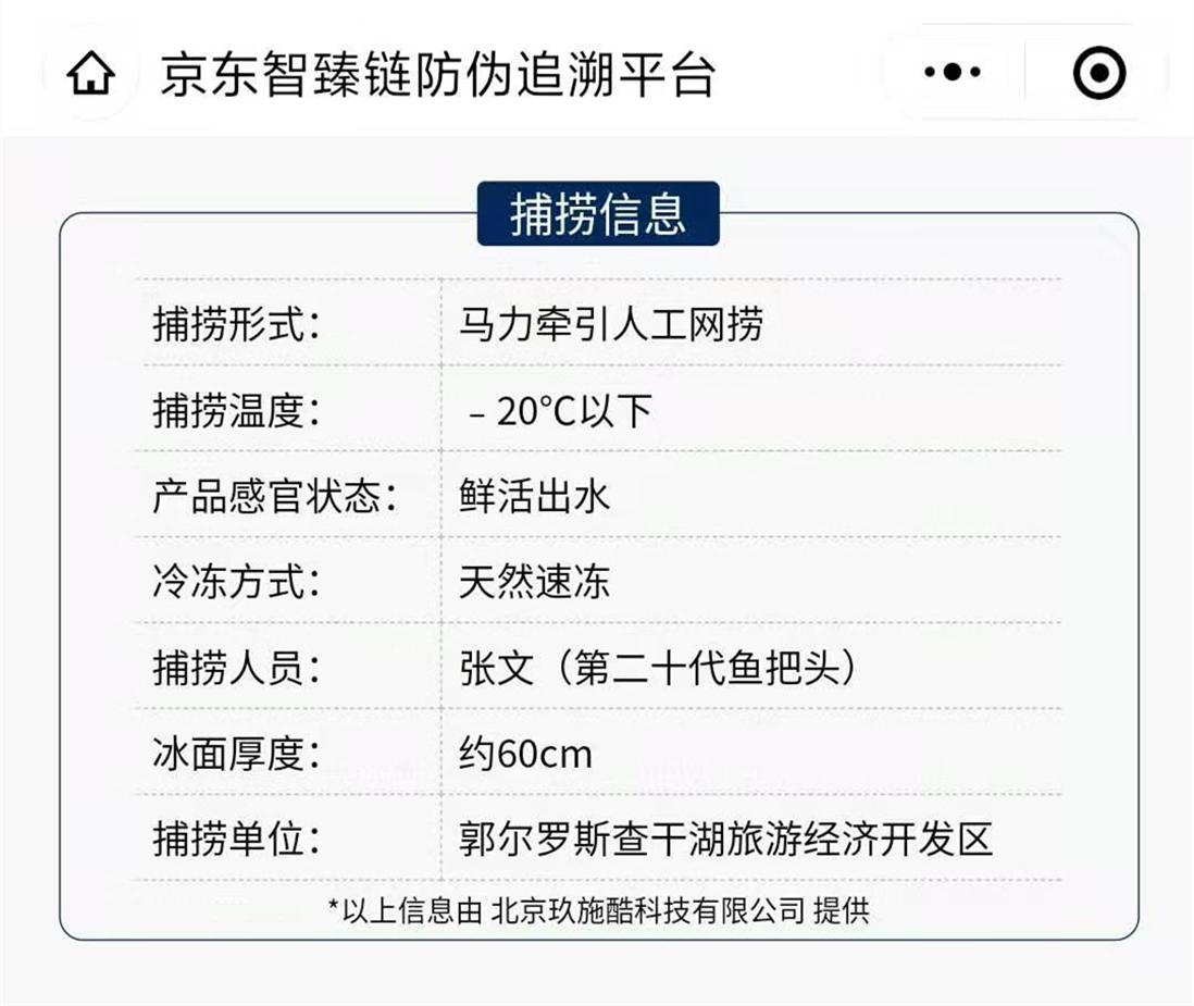 “我们从鱼的捕捞、加工,一直到最终的配送环节,都实现了全程溯源”,小闫介绍。今年,通过京东智臻链平台引入区块链技术,每一条发往全国的查干湖鱼实现了“一鱼一码”,消费者收到后可以扫码进行品质检验,放心地享受这份来自大自然的馈赠。
