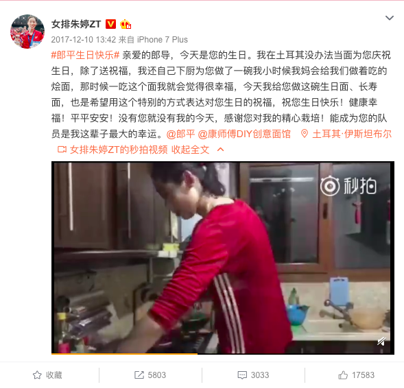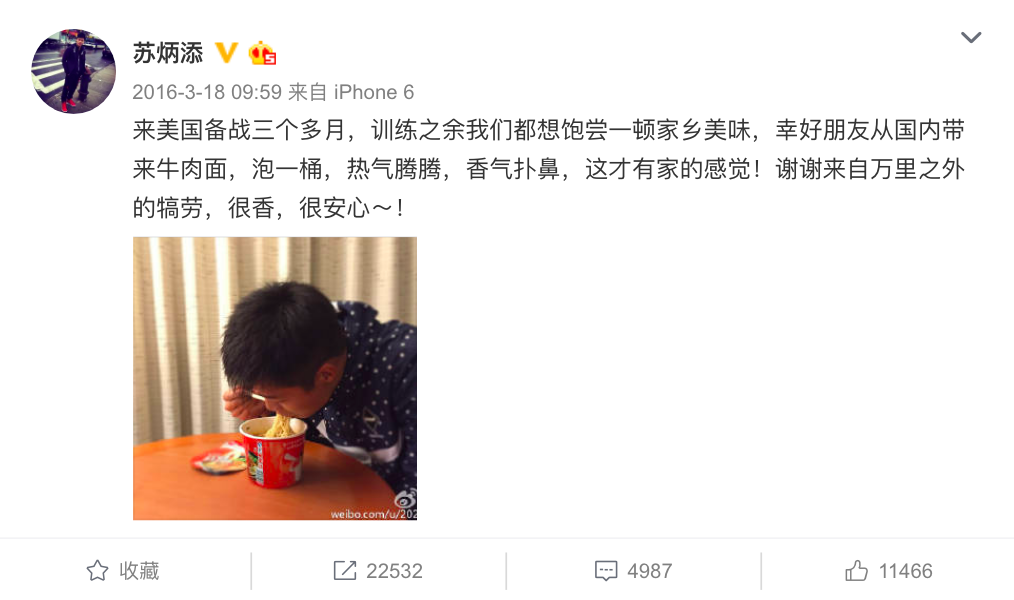被称为世界第一主攻手的朱婷堪称泡面的忠实粉丝,在土耳其留洋时想吃点中国味不容易,国内带去的泡面成了她的心头好,时不时还向队友安利;里约乒乓球男单比赛结束后,刘国梁在运动员宿舍里亲自给马龙、张继科煮面吃,难怪被网友调侃是最特别的夺冠庆祝方式;跑圈也躲不过泡面的真香魅力,苏炳添也时不时的用泡面来“奖励”自己。