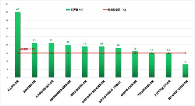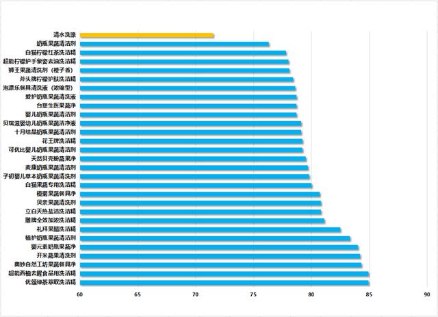 国家标准GB/T 24691-2009《果蔬清洗剂》要求,总活性物含量≥10%,GB/T 9985-2000《手洗餐具用洗涤剂》要求,总活性物含量≥15%。比较试验结果显示,30款样品的总活性物含量均高于《果蔬清洗剂》的标准。不过,在对样品进行《手洗餐具用洗涤剂》标准检测时,1款名为“宫中秘策婴儿奶瓶清洗液”的产品检测结果为8%,未达到标准限量值。