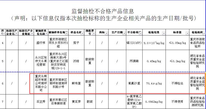 其中,不合格产品包括重庆永辉超市有限公司南坪东路分公司销售的鲜鸡蛋,氧氟沙星不符合食品安全国家标准规定。检验机构为湖北省食品质量安全监督检验研究院。