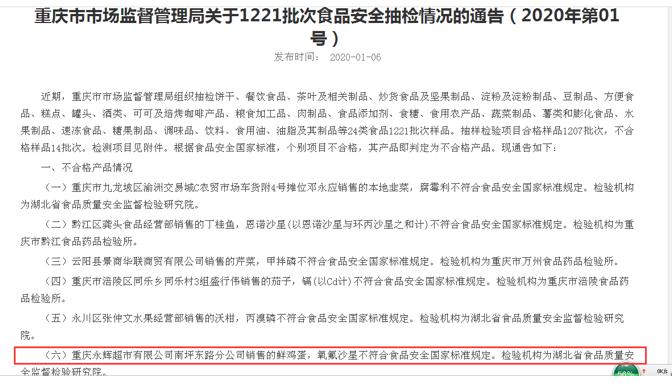 2019年11月21日,四川省市场监督管理局发布关于14批次食品不合格情况的公告。其中,四川永辉超市有限公司长宁县分公司销售的“鲜乌鸡”,不合格项目为磺胺类(总量),检验结果为701μg/kg,标准规定为≤100μg/kg。