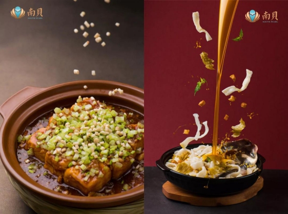 有餐必有饮,餐为南贝创意餐厅,饮为南贝茶庭。南贝茶庭以手工九段烧制的白瓷盖碗为主要茶具,环境优雅舒适。一杯茶,一本书,眺望湖景,便把生活过成诗。生于南畔,源天府之泉,盛于杯盏,道少年芳华⋯⋯诗意满满。徐孝洪坦言,“研发天府美食,传递美食背后的文化和意境,南贝一直在坚持。